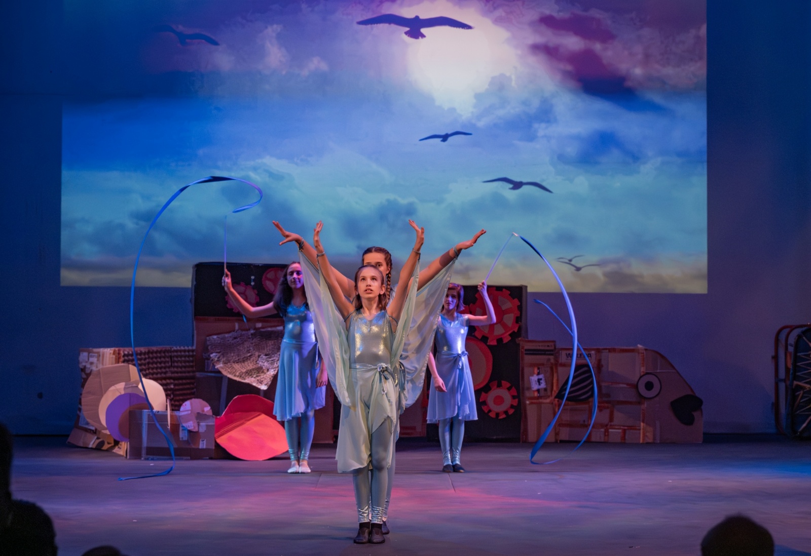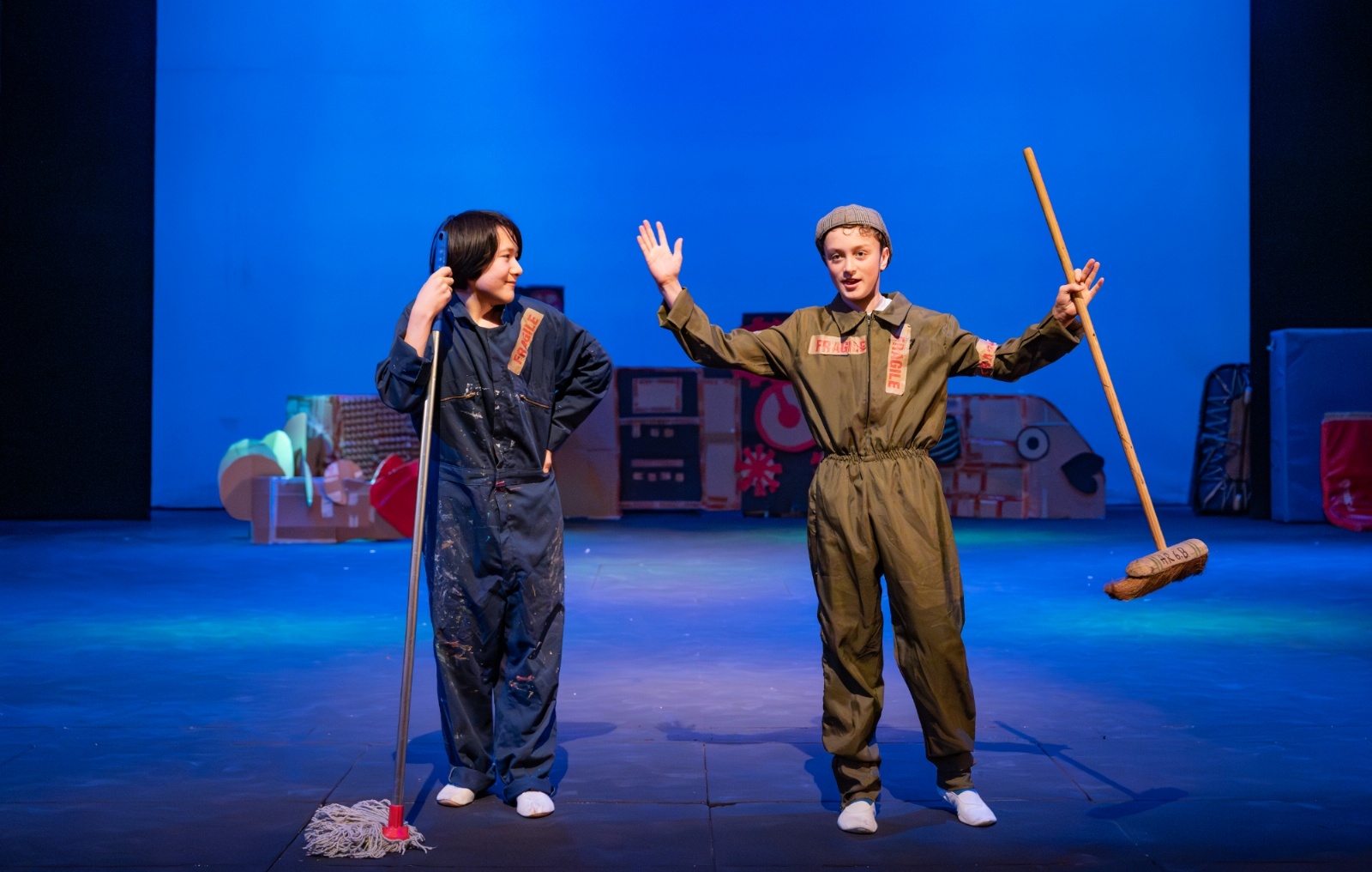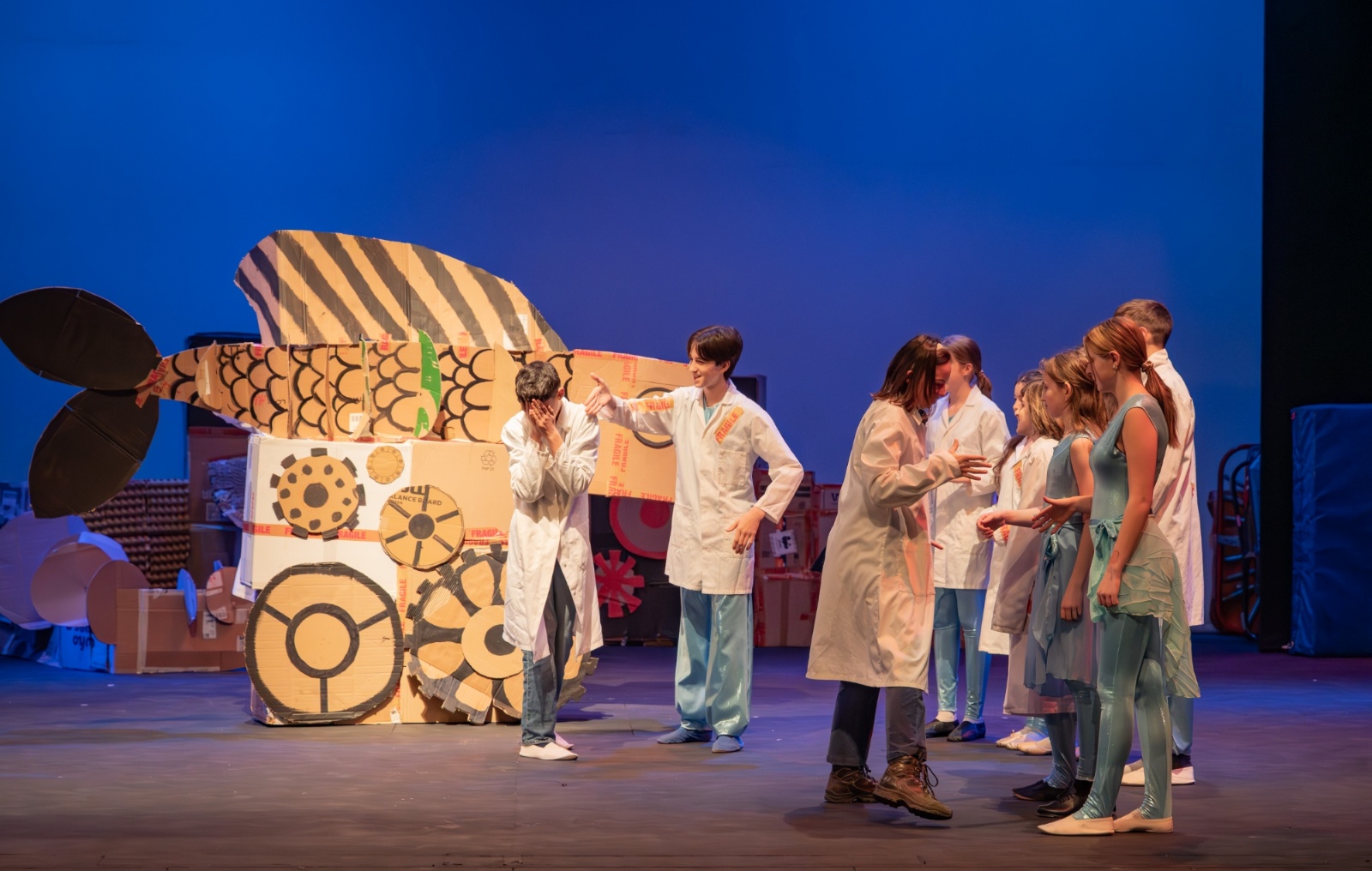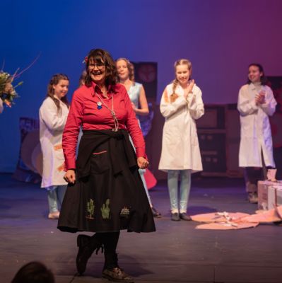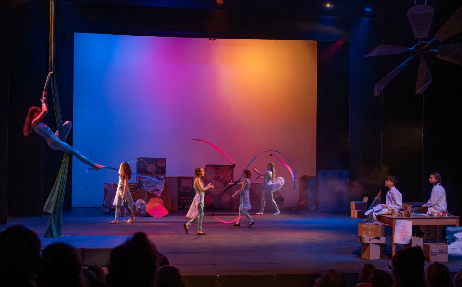 Members of the class then designed and created the set and all the different dances; they decided on the music; designed costumes which were then made by Carley Hague and some parents; and they had clowning workshops with Aiden Jinkins. Denis made over 150 recycled paper planes too.